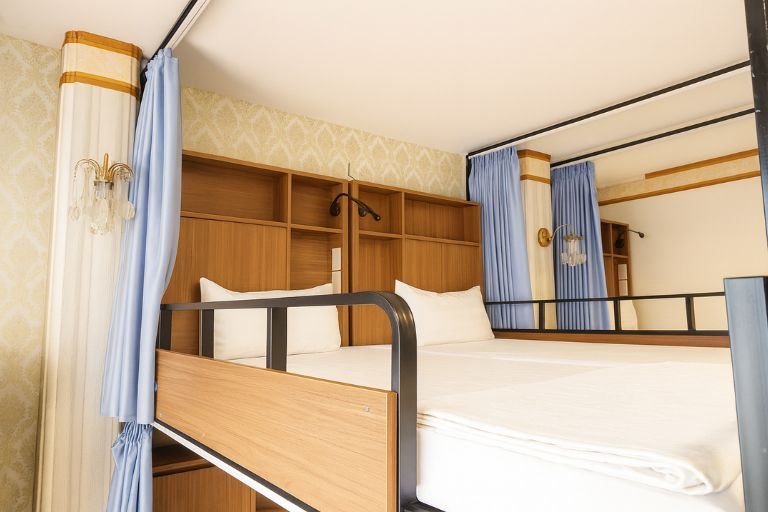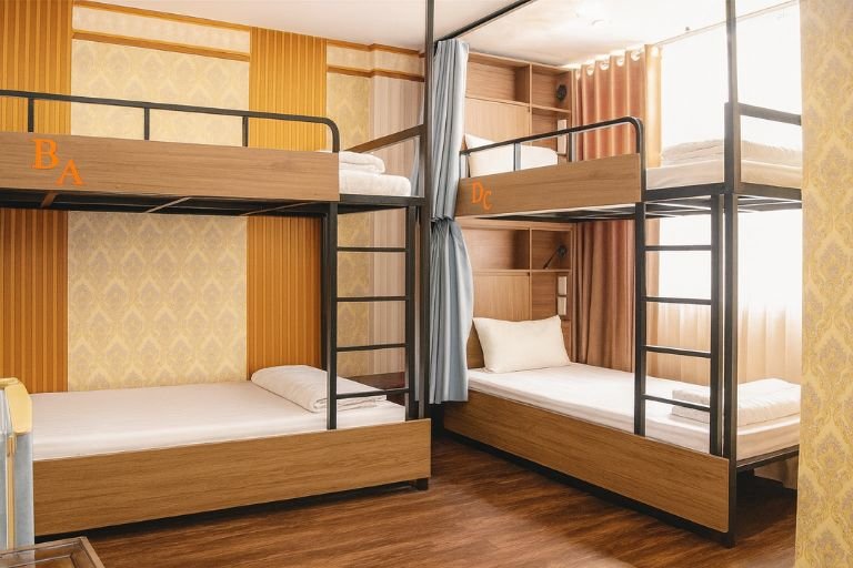 A comfortable shared space featuring sturdy bunk beds, personal curtains, and individual storage shelves—ideal for budget travelers looking for a clean and convenient stay in the Old Quarter.
